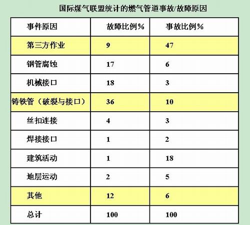 數(shù)據(jù)顯示,雖然第三方作業(yè)造成燃氣管道故障的比例只有9%,但是因其造成的事故總數(shù)卻占所有燃氣事故的47%。即使在燃氣事業(yè)發(fā)展相對成熟的歐美國家,第三方破壞事故的預(yù)防亦是有待解決的重要課題。如歐洲燃氣管道事故原因的統(tǒng)計比例中第三方損害占50%,美國的稍低、但也達到了39%。因此,隨著城市市政工程的不斷展開,第三方作業(yè)損害預(yù)防工作的開展應(yīng)引起我們的高度重視,加強巡線管理應(yīng)成為當(dāng)務(wù)之急。