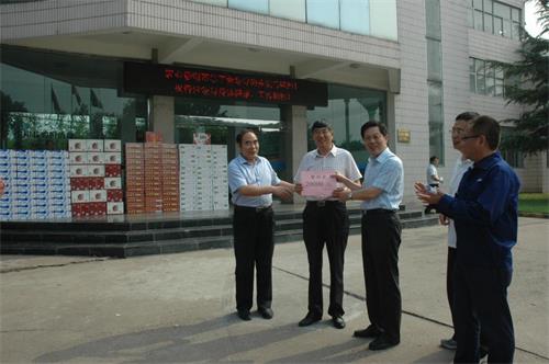 李小會董事長代表公司接受趙永貴主任(左三)發(fā)放慰問品